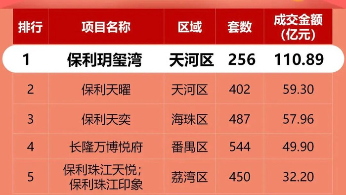 但今年前11个月,排名第一的保利玥玺湾项目成交金额已经来到110.89亿元,成交套数256套。